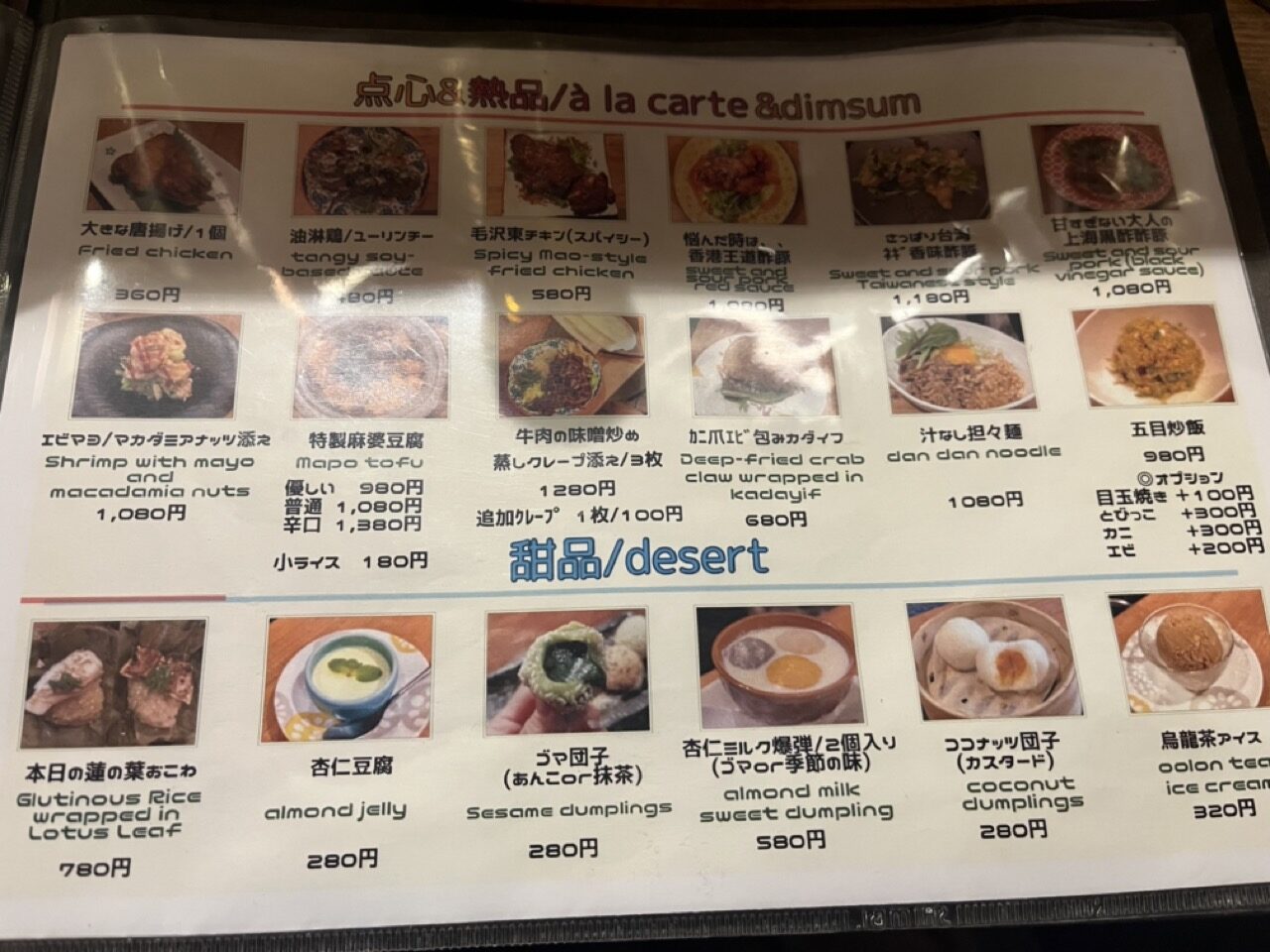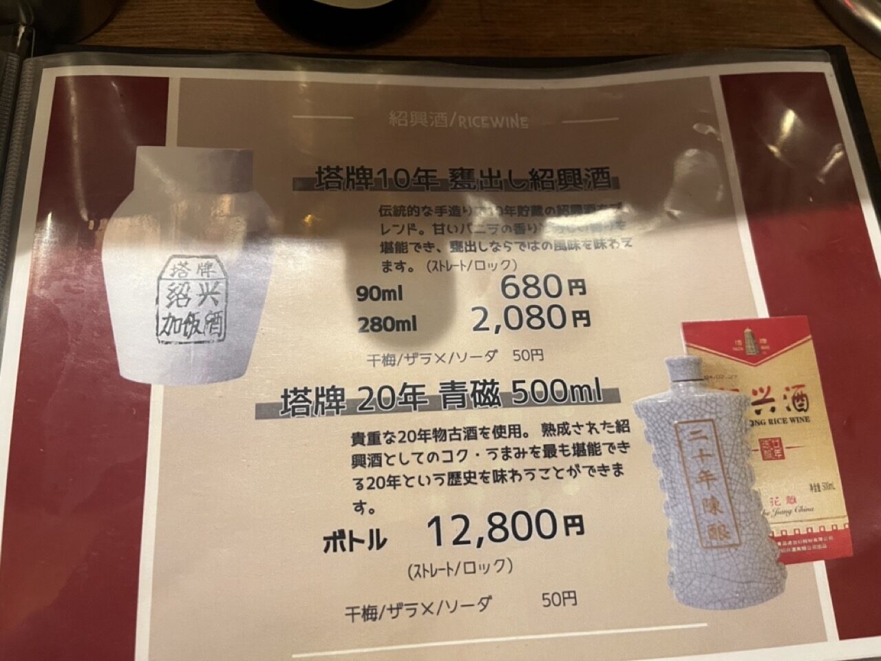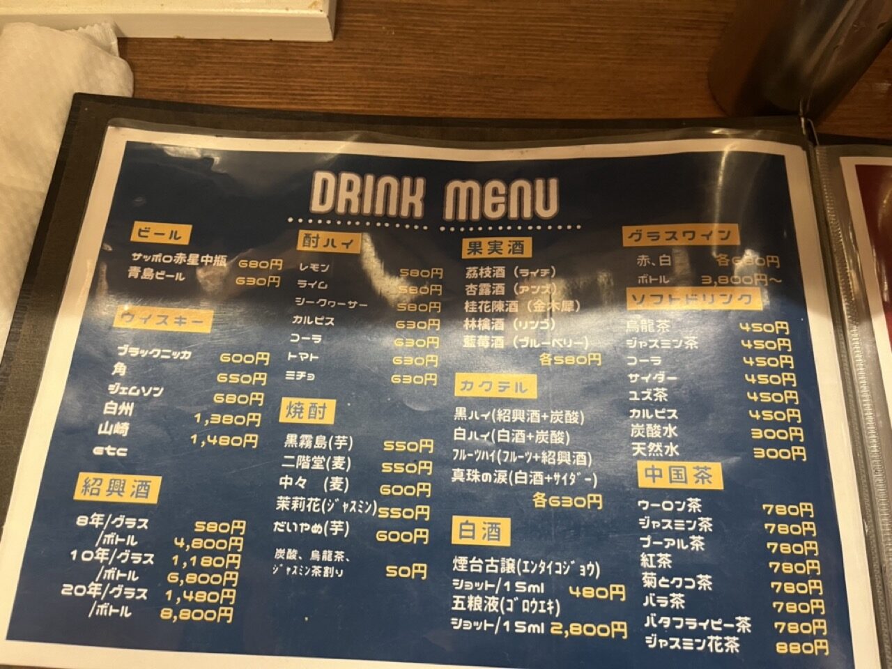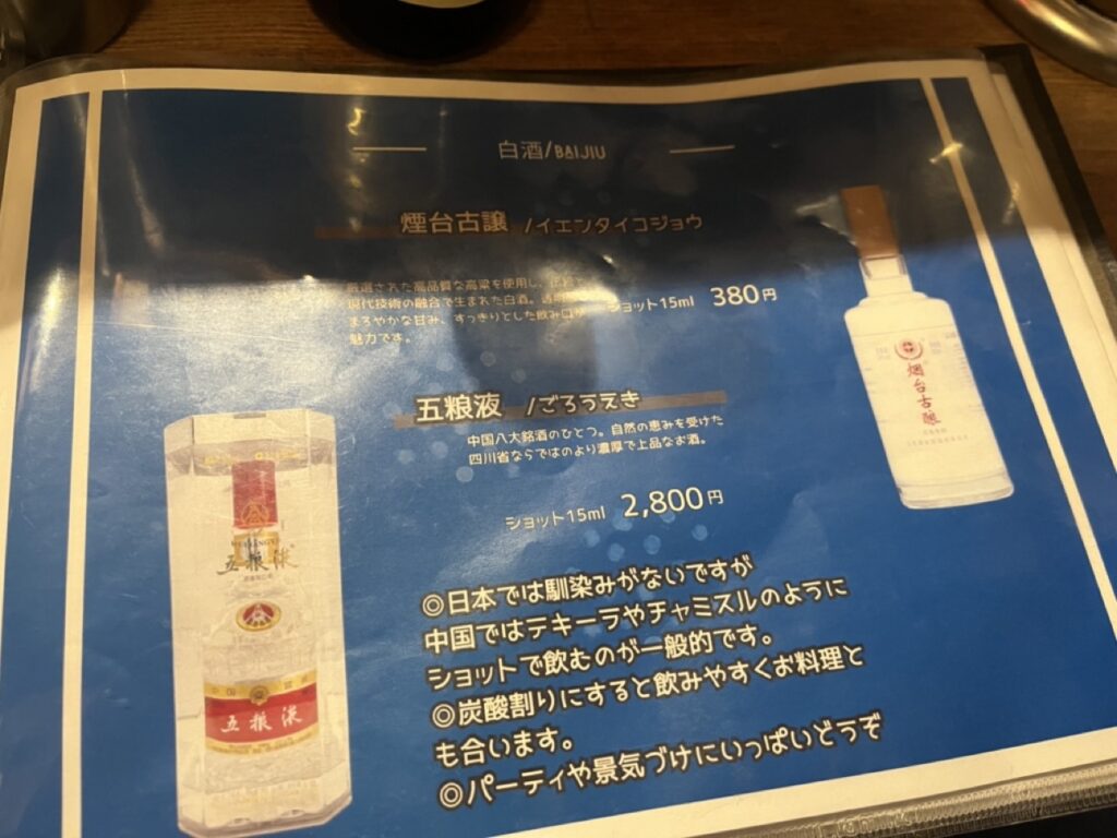 一般的なドリンクメニューに加えて中華らしく紹興酒や白酒も。中国茶にもこだわられているようでした。