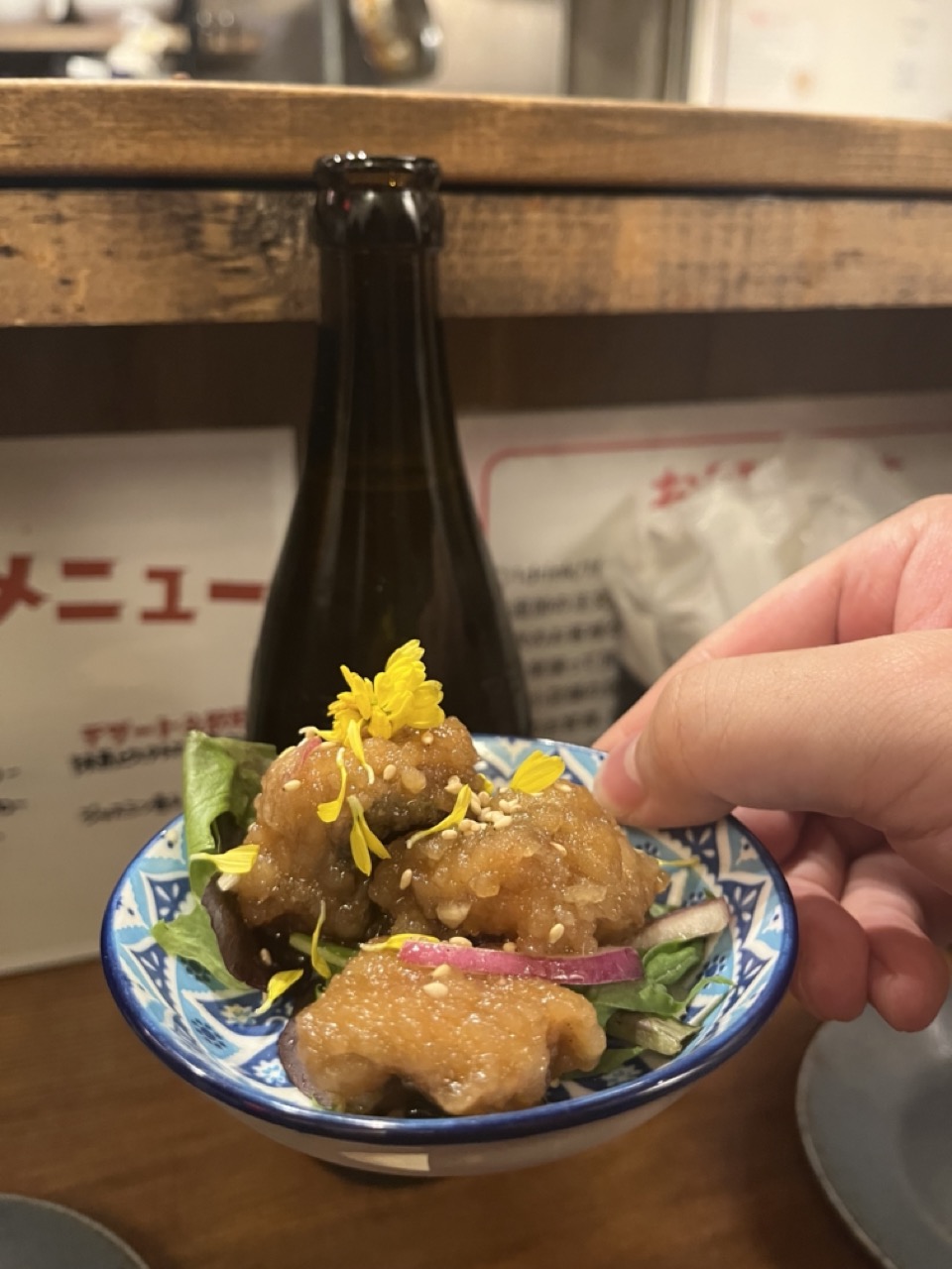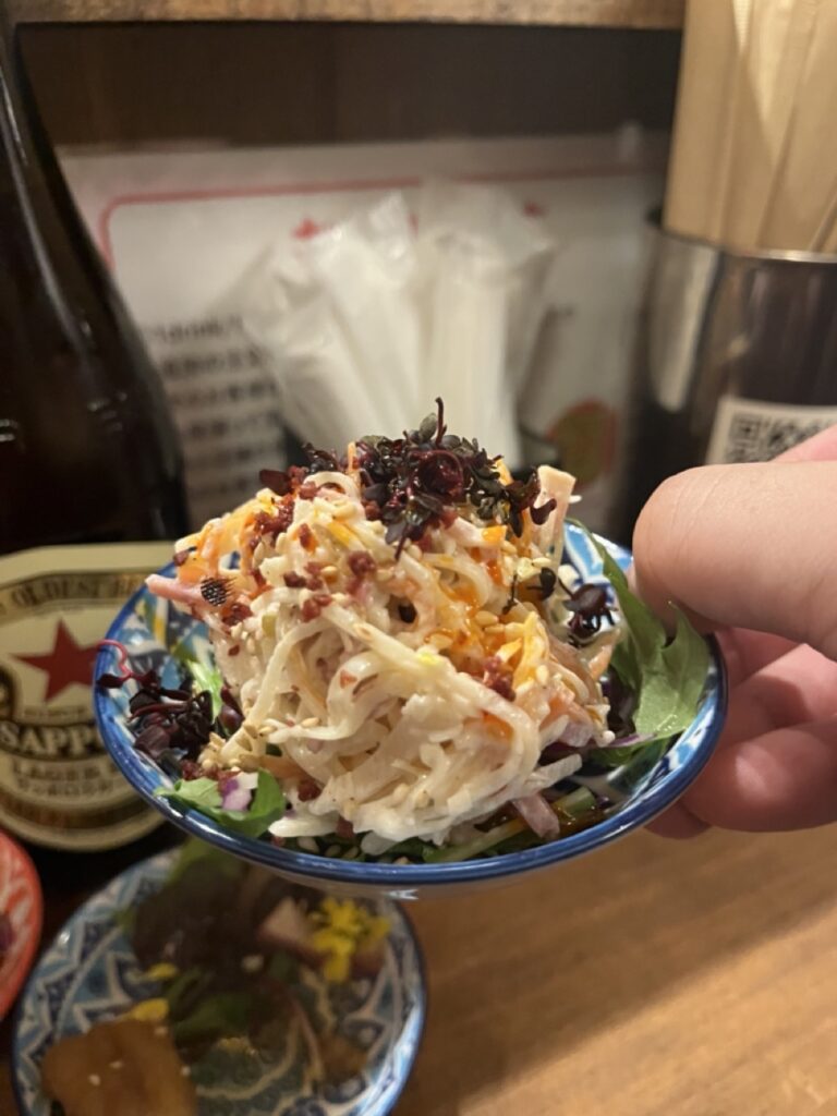 普段から新しく行くお店でメニューに迷ったときはおまかせを信じる主義。この日もまずは「おまかせ前菜盛り3種…980円」から開始。1品目は「太刀魚の南蛮漬け」。魚が珍しいですが、いい酢加減。