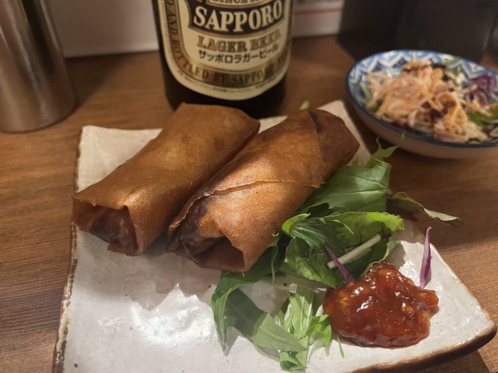 ここからは続々と点心がやってきます。まずは「五目春巻き…¥280円/個」。具沢山でぶっといですねえ。右下の味変アイテム、よく東南アジア料理店とかで見る甘辛いやつですかね?これ大好きなんで私的に買いたい。