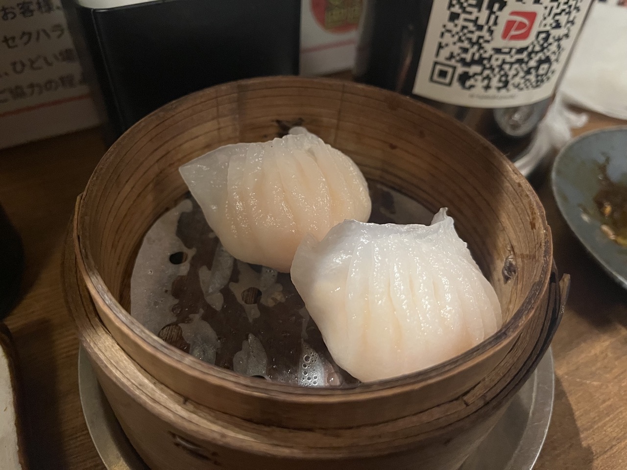 お次は「名物生エビ餃子…¥280円/個」。中のエビがブリンリン。ほかのお客さんも結構頼んでた印象。