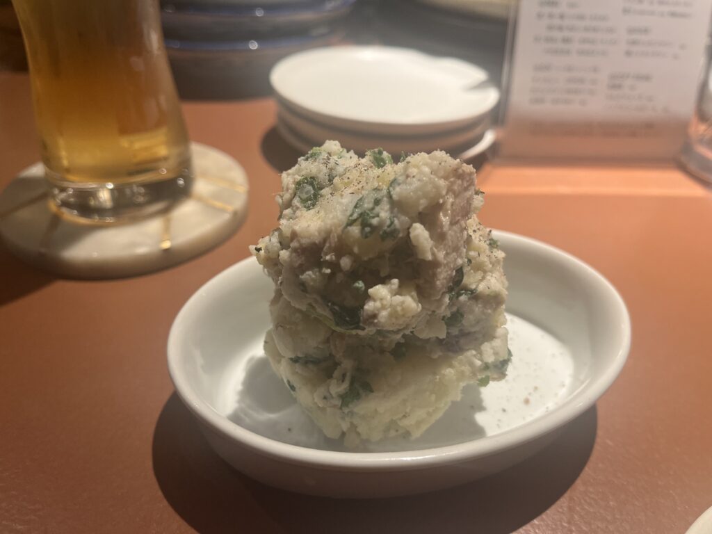 毎度毎度、「どんな料理なんやろ」てワクワクするメニューで楽しませてくれるぅ。まずは生ビールと「春菊とサバ缶のポテトサラダ…¥600」をオーダー。春菊のほろ苦さ。噛むたびに旨味が感じられるサバ。いい気分。