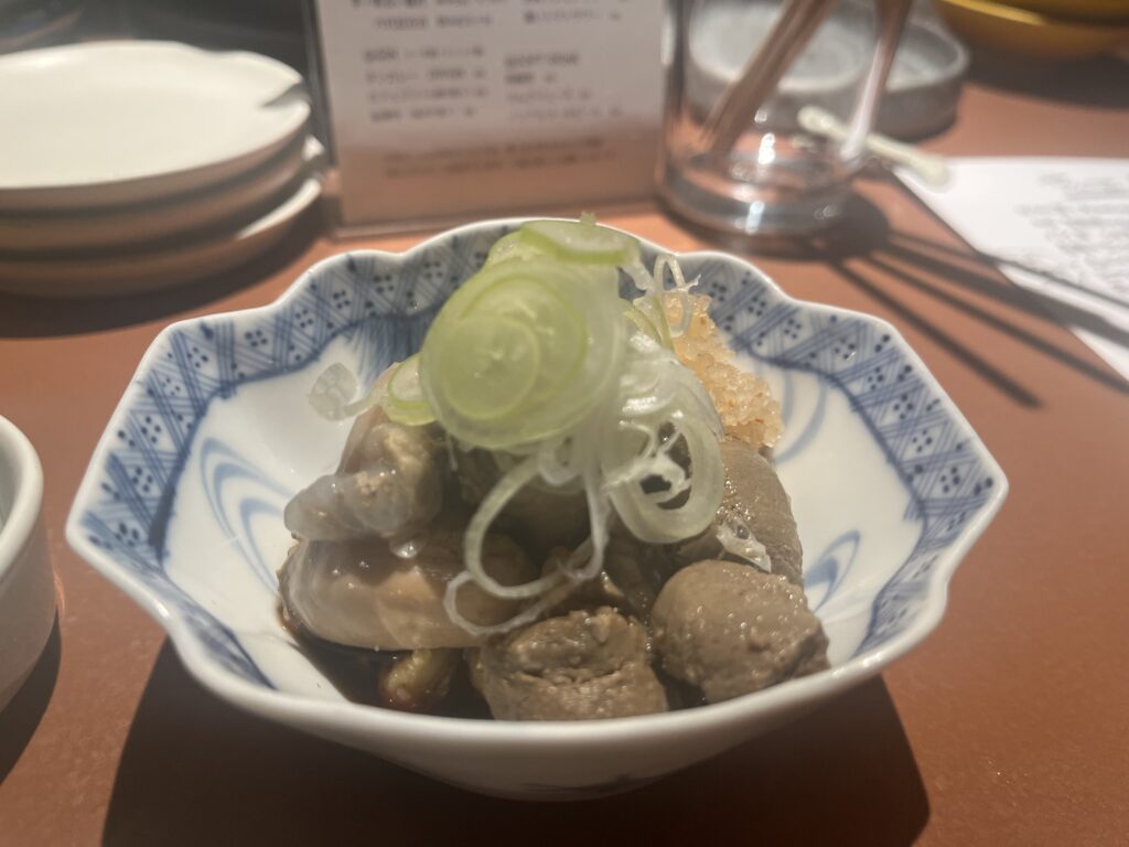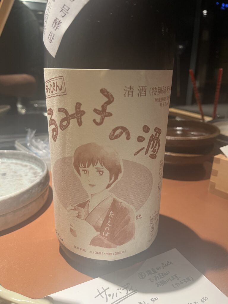 この日はバイ貝推し?で複数メニューがあったので、そのなかでも「白バイ貝肝ポン酢…¥450」をチョイス。これは完全に日本酒欲しくなる味。肝をちびちびいきながら、日本酒ぐびっと。「るみ子の酒すっぴん」は無濾過、無炭素、無添加の「生まれたままの」純米酒というところが由来とのこと。