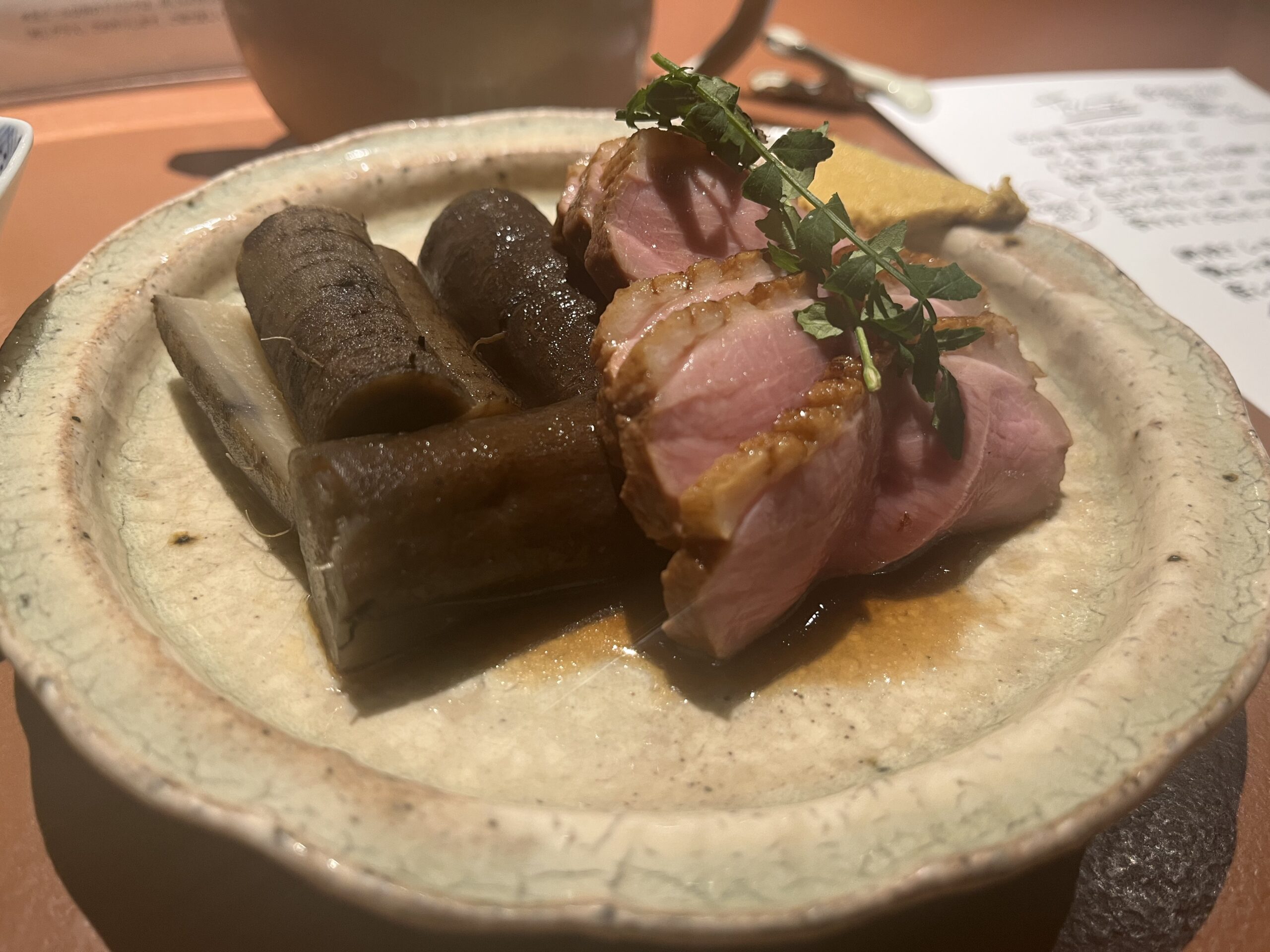 仕込みの関係?で毎回あるわけじゃない、あるときは絶対頼んでしまうのが「鴨ロース煮…¥1,300」。付け合せのお野菜は茄子とかの日もあったはずだけど、この日はごぼう。いずれにしてもお肉はもちろんお野菜が美味しいのがいいんだよな。これには七本槍を合わせていただく。美味しくて2合は飲んだ(笑)。