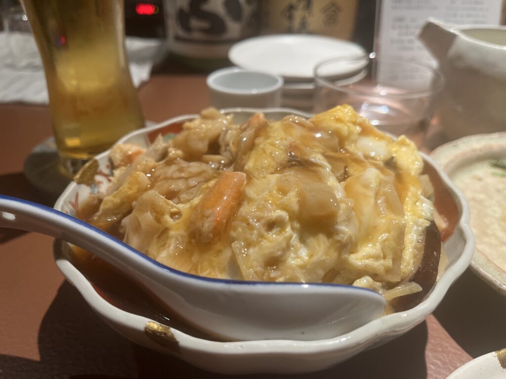 このあたりで19時ごろから提供とメニューに書かれていた「かに玉丼」が到着!他の人もみんな頼んでたしつられてしまった。あと隣のお姉様方に話しかけていただいて楽しく飲んでたけど、日本酒ぐびぐびで結構酔った(笑)。2軒目もご一緒してワイン飲んだけど、最後の方記憶ない、、、