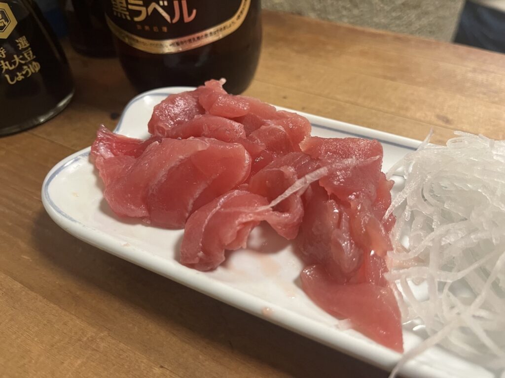 店に向かう地下鉄の中でweb上の口コミを色々見てたけど、みんな「マグロ刺身…¥480」を頼むとのこと。ここは便乗で。もちろん瓶ビールも忘れずに。喋りっぱの仕事後はしみるぅ。