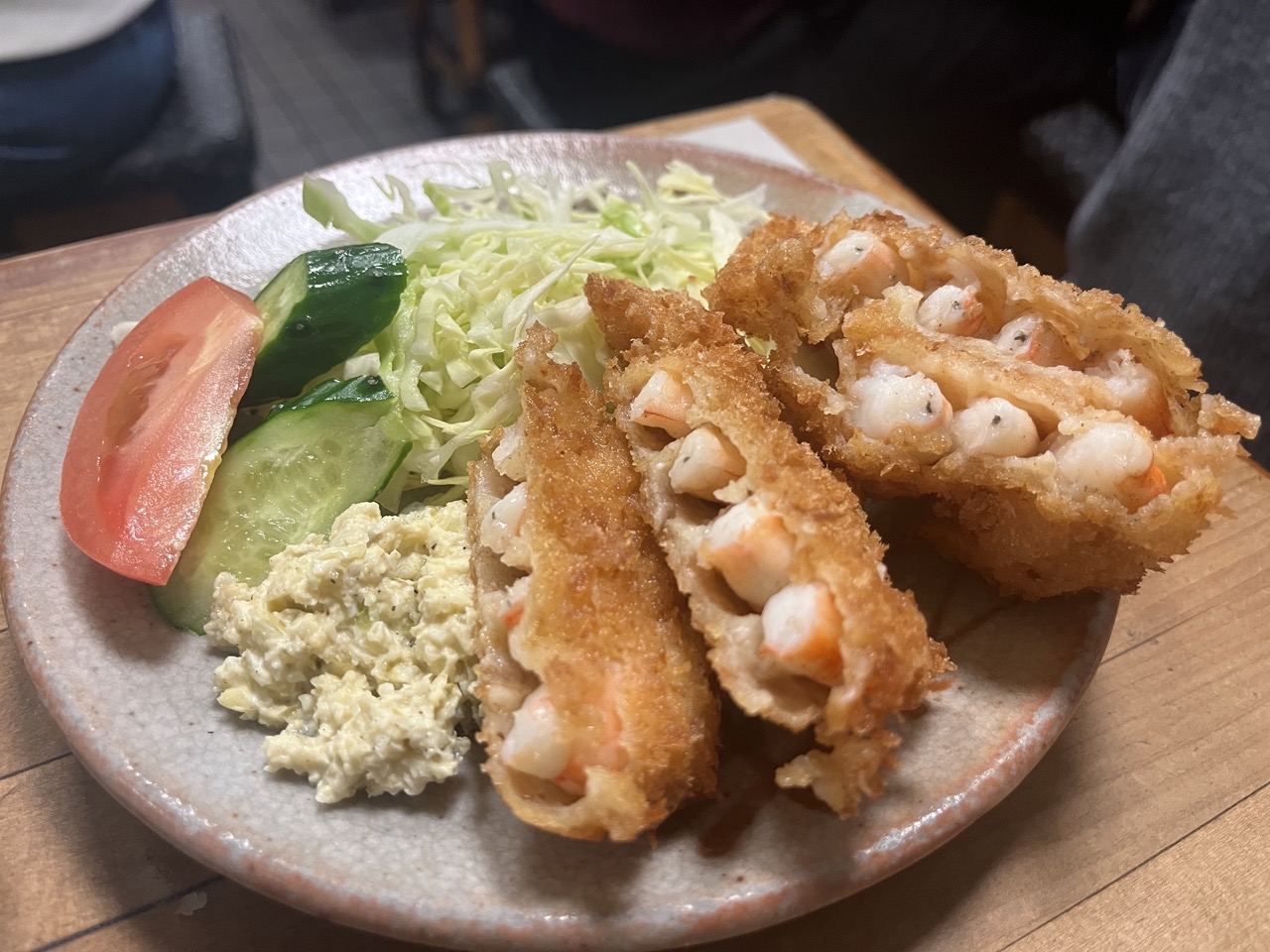名物と評判の「えびカツ…¥600」も注文!サクッと揚げられている。まあまあボリュームあるからおひとりさまには注意かも。ポテサラも箸休めにいい味出してる。